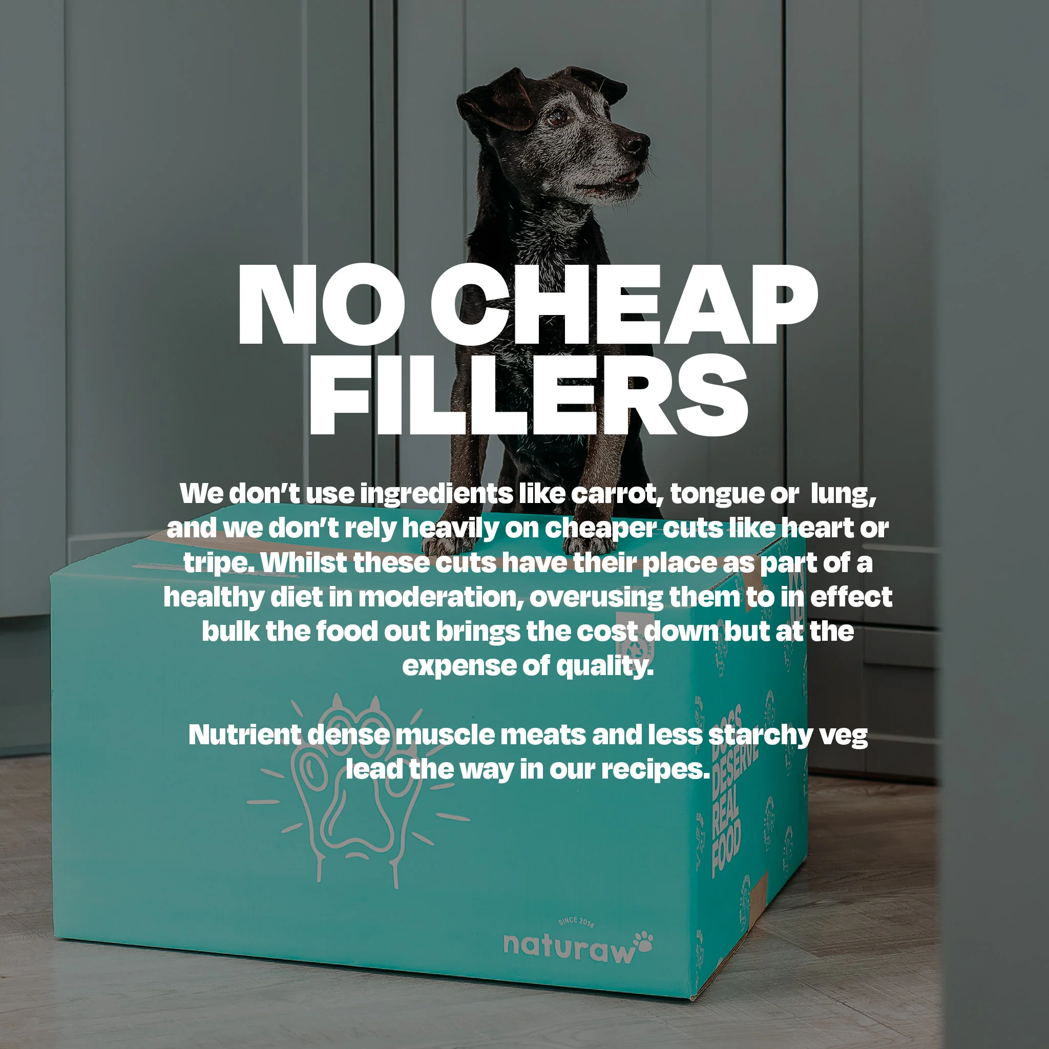 Simple, complete, honest raw food. Uncompromisingly made with the same values as our other ranges. A mix of our Free Range Chicken, Duck & Free Range Turkey recipes all balanced with a dash of fresh veg, free range egg Scottish seaweed & wheatgerm oil. Plastic-free packaging. Exceptional done simply.